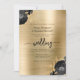 This elegant wedding invitation features black floral bouquets set off with gold faux foil greenery in two corners, on a background image of gold brushed metal. The customizable black text combines serif, italic and handwriting fonts. The reverse side features a matching black and gold floral and gold brushed metal design.