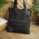 This elegant modern bridesmaid tote bag features a black watercolor agate design trimmed with gold faux glitter in two corners. The word "Bridesmaid" appears in gold-colored handwriting script on a dark off-black background. Add her name in gold-colored copperplate font.