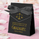 This chic custom black and gold law school graduation party favor box features the college graduate name in elegant typography for the class of 2026. Customize with your university under the scales of justice for a great graduation keepsake for a new lawyer or attorney.