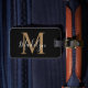 Elegant black and gold monogram luggage tag with customizable script name. A stylish, durable travel accessory for easy bag identification and modern personalization.