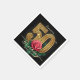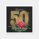 Celebrate a half-century of life with sophistication using these elegant 50th birthday party napkins. The design features a stunning contrast of a matte black background paired with luxurious faux gold foil ornate typography. A romantic, realistic red rose with deep green leaves accents the number 50, adding a touch of floral glamour.