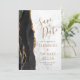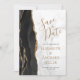 Det moderna bröllop spara datum-kortet från elegantens lämnat kant har en svart vattenfärgad agate gräns som trimmas med faux guld glitter. Anpassadet kombinerar handskrift, tryckplåt och kursivt typsnitt med guld-färgad och svart på vit, grått och silver marmor. Den omvända sidan har en matchande svartvit och guld agate-design.