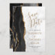 Det moderna bröllop spara datum-kortet från elegantens lämnat kant har en svart vattenfärgad agate gräns som trimmas med faux guld glitter. Anpassadet kombinerar handskrift, tryckplåt och kursivt typsnitt med guld-färgad och svart på vit, grått och silver marmor. Den omvända sidan har en matchande svartvit och guld agate-design.