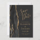 Det moderna bröllop spara datum-kortet från elegantens lämnat kant har en svart vattenfärgad agate gräns som trimmas med faux guld glitter. Med anpassadet kombinerar du handskrift, formatmall och kursivt typsnitt med guld-färgad mot svart bakgrund. Den omvända sidan är solid off-black.