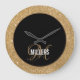Modern väggklocka med guld glitter gräns, svart bakgrund, guld-manusmonogram och en vit familj namn. Anpassa med din första familj och namn.