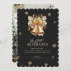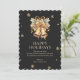 Svart och guld-fotokort med helgdag på framsidan med två julklappar på klockor och snöflingor och ett foto på baksidan. Anpassa enkelt det här visitiva helgdag med ditt foto och din text.