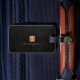 Luxury-bagagemärke med svart läderbakgrund och en faux guld-metallisk borstad ruta med elegant-skript namnteckning namn och monogram initialer. +++++++++++++++ Enkel att anpassa skapande av din egen logotyp med ditt företag eller initialer och namn. +++++++++++++++++ kan vara ett tillbehör till företag för personlig av eleganter, med varumärke.