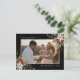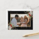 Elegant svart och guld-fotojulkort med vit poinsettia, skum och bär.