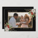 Elegant svart och guld-fotojulkort med vit poinsettia, skal och bär.