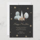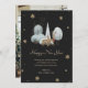 Svart och guld-fotokort för Gott nytt år med snöflingor och vinterplats med renar på framsidan och ett foto på baksidan. Anpassa enkelt det här helgdag till eleganten med foton och text.