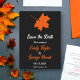 Den här eleganten faller bröllopet, förutom datumet då inbjudan är perfekt för ett modernt höstbröllop. Den enkla designen har rött höst löv med elegant vit och röd typografi på svart bakgrund.