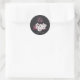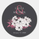 Dessa 3-tums x 3-tums klassiska runda bröllopsmärken i elegant har en vacker blommigt i svart, magenta och vitt på en svart bakgrund med platshållare för möhippans första datum namn och bröllop.