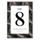 This elegant wedding table card features a minimalist design with a bold, black number "8" centered on a white background. The layout is framed by a luxurious marbled border in dark gray and gold tones, adding sophistication to the contemporary style. Above the number, the word "table" is written in an elegant script font, while the names and date are displayed in clean, uppercase sans-serif typography. Perfect for formal occasions, this card conveys understated elegance and formality through its restrained color palette and modern aesthetic.
