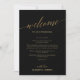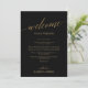Dessa välkomstkort för elegant guld och guld bröllop är perfekter för ett enkelt bröllop. Neutraltens utformning har romantisk och vismisk faux-folie-typografi av guld på svart bakgrund. På kortets framsida finns ett välkommet brev och på kortets baksida finns en rutt i bröllop. Dessa anteckningar är perfekt för destinationsbröllop och hotellgästväskor.