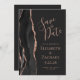 Det moderna bröllop spara datum-kortet från elegantens lämnat kant har en svart vattenfärgad agat gräns som trimmas med faux ro guld glitter. Med anpassadet kombinerar du handskrift, ritplatta och kursivt typsnitt med handskrift för ro rosa mot svart bakgrund. Den omvända sidan är solid off-black.