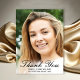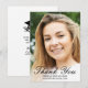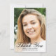 Skicka ett foto med elegant anpassningsbar studenten tack vare ett platt kort till familj och vänner med ett foto på framsidan med svartskript med calligraphy overlay som läser "Tack" med ditt namn, din skola och året därnedan för att anpassa dig. Kortets baksida har ett tackkort och namnteckning för att du ska kunna anpassa det efter en svart studentmössa. Gratulerar på studenten. Designad av konstnären Susan Coffey.