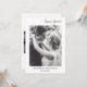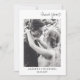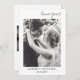Frontsäger "Tack" i ett enkelt modernt typografi och utrymme för datum för namn och bröllop, medan baksidan kan vara personlig med ett foto och ditt eget personliga meddelande i en enkel svart typografi.