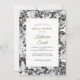 Sofistikerad vintage, klassbild och snyggt illustration av botaniskt svart och vit ros och löv på vit bakgrund med ram och mörk grått och guld-skript och seriös text som lätt kan redigeras.