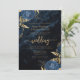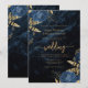 Den här inbjudan från elegant bröllop innehåller blåa blommigtar som är uppställda med guld faux foil grey i två hörn, på en bakgrundsbild av marinblått vattenfärgsagat. Anpassadet kombinerar guld-färgad serif, italic och handskriftsformat typsnitt. Den omvända sidan har en matchande marin blå och guld-blommigt och agate-design.