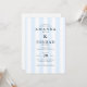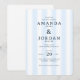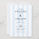 Denna bröllopsinbjudan har en vertikal layout med ljusblå och vita vertikala ränder som skapar en luftig och elegant atmosfär. Designen använder ett klassiskt serif-teckensnitt i mörkblått för texten, som är centrerad för att upprätthålla balans. Färgpaletten med blek himmelblå och rent vitt förmedlar friskhet och sofistikation, vilket gör den perfekt för en formell firande. Anpassningsbara element möjliggör personalisering av namn, datum och platser, medan den övergripande stilen utstrålar glädje och förväntan inför det speciella tillfället.