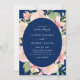 Den romantiska och moderna bröllopsinbjudan till blommigten är perfekt för vilken säsong som helst. Eleganten blommor och grönsaksovala ram ser fantastisk ut på marinblått underlag. Ett vackert kalligrafiskt skriptteckensnitt kombineras med ett traditionellt serif-teckensnitt. Ändra enkelt typsnitt till valfritt med hjälp av onlinen template verktyg.