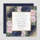 Blåblått och bröllopsinbjudan för elegant med blått och rosa ros som sätter upp närmare uppgifter om bröllop i en guld ram, med blommigt guld./konetti.
