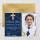 Tack familj och kära för att du har varit i din sons första Heliga-förening eller ge en gåva med eleganten guld kor och den burgundi första Heligan-gemenskap tack vare ditt kort. Den här designen har ett vackert gyllene kor med ett gyllene ram mot en enkel burgundisk bakgrund. Baksidan har en grumlig bakgrund med guld polka dots. Byt ut fotot mot en bild av ditt barn. Anpassa texten och teckensnittet efter dina önskemål. Annat typsnitt och stilar tillgängligt. Kontakta oss med dina speciella förfrågningar och vi skulle vara lycklig för att hjälpa dig.