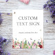 Feminint och modernt, denna partiskylt kan anpassas för din bröllopsfest. Designen har en vacker trädgård med akvarell rosa och lila blommor, inklusive rosor, tulpaner, lavendel och eukalyptusgrönska med färgglada fjärilar och humlor som flyger runt.