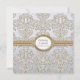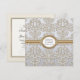 OBS: Detta är en platt tryckt design. Det finns inga faktiska juveler, spännen, ramar, metall eller skiktade föremål. Allt är vackert renderat genom grafisk design. FÄRGPALETT is, vinter, grå, kräm, vit glansig look och varm silver metallisk look. DESIGNMOTIV: Matchande personlig namn och monogram, bröllopsinbjudningar med en magnifik elegant formell look. Denna design skulle vara extra fantastisk tryckt på det isiga eller champagne-metalliska papperet. Det finns en komplett ensemble av produkter som har skapats för att matcha. Ditt monogram och namn är centrerat i en elegant guld dimensionell smyckesstil ram i oval form med barock utskärningssnörkel. Detta är en originell konstdesign av Audrey Jeanne Roberts som har en modern, samtida, trendig och chic känsla. Det är en grafiskt designad version av ett damaskmönster, renderat i en glänsande, glitterlook med en tunn guldmetallisk kant och överlagd på en ljus bakgrund med textur och en svag färgövergång från topp till botten. Många färgalternativ finns tillgängliga. På baksidan finns en mjuk krämfärgad bakgrund, en matchande guld- och glänsande ram med en matchande uppsättning Spencerian-handstilsfloskler, antika tryckarornament fl