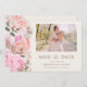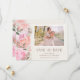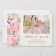 Denna vackra, eleganta blomfoto Save the Date är designad med en klassisk blandning av rosabränd och mjuk rosa och är perfekt för dem som älskar charmör från vintage-estetik och romantiken hos blommande peonior. Ett idealiskt val för vår-, sommar- eller höstbröllop. Den unika designen lägger till en touch av sofistikering och elegans till din speciella dag och sätter tonen för en vacker romantisk firande.