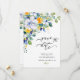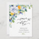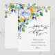 Meddela din fest med detta eleganta blommande gula och blåa akvarell-spara-datum-kort. Med känsliga akvarellblommor och graciösa blå blomsteraccent med gula blommor, speglar designen skönheten i en botanisk trädgård. Dammtorrt blått och guldtoner i kombination med en blå och gul bröllopspalett skapar en perfekt sommar-vår-annonsering.