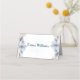 Elegant platskort för bröllop med mjukt blått blomsterarrangemang, perfekt för klassisk och romantisk bröllopsdekor.