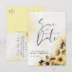 Meddela din bröllopsdag med detta eleganta akvarell solros blomsterpostkort. En blandning av modern kalligrafi och vintagekonst med vackra gula nyanser. All text kan ändras och anpassas förutom "Spara datum"-titeln på framsidan. Fler vintageinspirerade bröllopsinbjudningar finns tillgängliga i vår butik.