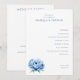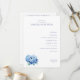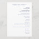 Det här bröllopsprogrammet har en ren och minimalistisk layout med gott om vitt utrymme, vilket skapar en elegant och sofistikerad atmosfär. Designen inkluderar en akvarellillustration av blå peonior på vänster sida, vilket ger kompositionen en touch av naturlig skönhet. Typografin kombinerar seriffer och sans-serif-teckensnitt för en modern men ändå klassisk look, medan färgpaletten huvudsakligen består av djupblått och ljust grått, vilket förstärker den lugna och formella stämningen. Perfekt för par som söker en förfinad och festlig design för sin speciella dag.