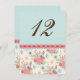 Vacker bordskort för bröllopsfesten, med en färgrik korall- och blå blandning av blommor på kortets nedre halva, och ett blåmunkeguldspräckligt mönster på toppen. Underbara produkter för bröllop finns att mixa och matcha. Personanpassa numret för varje bord på er fest.