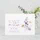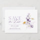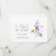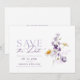 Meddela din speciella dag med detta eleganta "Spara datum"-kort med ömtåliga akvarellblommor i lila och elfenbensfärgade nyanser. Perfekt för romantiska och tidlösa bröllopsteman. Personliga detaljer.