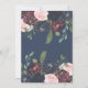 Den här vackra bröllopsinbjudan innehåller vackra, trendig marinblått, plommonblått, lila och vattenfärgade blommor i rosa och botaniska löv och löv i grönt. Den blå kalligrafin i eleganten ger en klassisk beröring och huvudtexten är en modern blandning av marin och plommon, allt på vit bakgrund. Baksidan av inbjudan innehåller mer blommigt grafik på en passande mörk blått bakgrund.