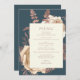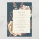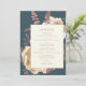 Den här elegant bröllop-menyn har en lush, romantisk blommigt bouquet i elfenben med ro guld faux foil och glitter blad på en tealblå bakgrund. Anpassa ro rosa-texten i snyggt typsnitt på en elfenbenstorn. Kortets baksida är en solid teal.