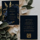 Den här eleganten innehåller den moody bröllopsinbjudan en lush, romantisk blommigt bouquet i marinblått med guld faux foil och glitter blad på mörk blått bakgrund. Anpassa guld-färgad-texten i typsnitt snyggt på en mörk blått rektangel. Den omvända sidan ger plats för bröllop-information på en solid mörk blått bakgrund, tillsammans med en QR-kodgäst som kan söka på din webbplats och OSA, vilket sparar kostnaderna för utskrift och utskick av separat OSA kort.