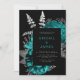 Den här eleganten innehåller den moody bröllopsinbjudan en lush, romantisk blommigt bouquet i tårblått med silver faux foil och glitter blad på svart bakgrund. Anpassa silver grått och tealtext i typsnitt i snyggt på en svart rektangel. Kortets baksida är starkt svart.