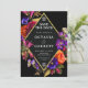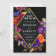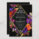 Den här eleganten har det formella blommigten bröllop spara datum-kortet lila, rött och orange blommor i svart bakgrund. Fet vit text gör att du kan spara verkligen med datuminformation. En underbar typografi arrangemang om guld brev som är dekorerad med blommor placeras på baksidan. Det här objektet är en del av Midnight Save the Date Collection.