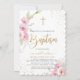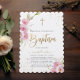 Modern Baptism-inbjudan till elegant. Utformningen har blommigt inslag i den ljusa rosa färg, sprinkles från guld glitter, "Baptism" i guld, guld kor och party. Perfekt för tjejen Baptism firande.