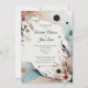 Inbjudan innehåller en elegant som är utformad med en bakgrund med grädda färgader blandad med mjukt färg och konstnärliga blommigtar och löv illustrationer. Namn från bröllop-paret är skrivet med en fantastisk manustypografi. Under namn finns det information om händelsen bröllop skriven i ett mindre teckensnitt men fortfarande i elegant. Blommigten och löv som omger texten gör inbjudan mer elegant.