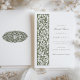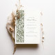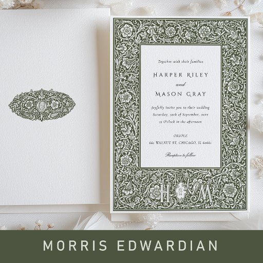 Lägg dina gäster i inbjudningskort för möhippan i en tidlös elegans, med en fantastisk oliv grönt och gräddan färg palett. Denna inbjudan inspireras av William Morris invecklade botaniska design, en figur-synonym med British Arts and Crafts Movement. På inbjudningens framsida visas ett lush-band med blommigt- och bladmotiv, medan baksidan innehåller all information som behövs för ditt speciella tillfälle. Den ömtåliga uppspelningen av olivskuggor mot en krämt bakgrund gör det möjligt att bjuda in både sofistikerade och inbjudande. Detta vackra kort är perfekt för den blivande bruden som uppskattar naturens skönhet och den klassiska beröringen av historiska konstmotiv.