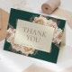 I den här eleganten finns det ett tack-kort i bröllop som innehåller buketter för elfenben och blommigt i ro på mörkens grönt. Orden "Tack" visas i mörk ro serif-teckensnitt på en elfenbensrektangel. Lägg till namnen för bruden och trimningen nedan.