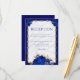 Ange viktiga detaljer om ditt bröllopsmottagande med det här kortet för inbjudan till elegant, med guld smyckade filigree-format med mjuk vit satin, krökt med blått ro. Den simulerade royalets blå metallbakgrund förstärker den lyxaktiga känslan.