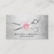 Moderna affärskort och eleganter för hårstilister med faux silver sax, rosa och vit ros, faux silver bakgrund och elegant calligrafteckensnitt.