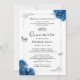 Skapa dina egna unika, personlig-fotoinbjudningar med hjälp av en redigerbar DIY-mall som utan problem rymmer händelseinformation för anpassningsbarna bild och party. Skapat med originalkonsten Raphaela Wilson skryter eleganten med en vacker blandning av faux metallic silver butterfly konetti, en regal prinsessa krona / tiara, och delikat royal blue water color ro, vilket ger en blommigt saga touch. En vintage med en klänning gräns ger större charm på båda sidor, medan baksidan av kortet har en botanisk mönster av blått ro. Med ytterligare anpassningsalternativ kan du anpassa den här mallen för inbjudan till visuella sagor efter dina inställningar. Ändra typografin stil, övergå från det uppvisade kalligrafiskriptet och det moderna typsnitt för att bättre kostym finare. Dessa inbjudningskort för elegant DIY-mallen, perfekt för en lyxig quinceañera, ger sig också på ett royal blått sött 16 födelsedagsfest, ro-temat bröllop, en gång på en möhippa, Cinderella babydusch och annat tillfälle där man vill ha ett fängslande silver och blått party tema. Oavsett om du tar ställe på vintern, sommaren, hösten/hösten eller vår kan de här elegantens fotoquinceañera-inbjudningar upphöja din Big Day med lite gnistra och elegans. Njut! Kategori: Mis Quince Anos-mall quinceanera-inbjudningar med foto; bröllopsinbjudningar för royal blå och silver; och blå söt 16 inbjudningar till dotter/ henne. Royalets blå quince party tema färg: mörk blått, medelblå marin, safir, lätt grått, mörk grått, silver, svart och vitt.