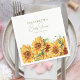 Blommigt av solrosblommor av gult blåser bouquet gräns med grönt lövblad skapar elegant boho chic sommar fallträdgård baby i blommdusch vår personligerna blöjor med nyssnäckande papper med modernt, handskrivet kalligrafiskript över en vit bakgrund.