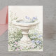 vykort för elegantens blommigt med en vattenfärgad illustration av ett födelselbad omgivet av en trädgård med blåblommor och rosa blommor och löv som växer runt basen av födelsemadagen. Blånet är skilt i olika gröntar. En neutralt beige vattenfärgsbakgrund och muterat och pastel färg bidrar till ett gott och mjukt estetiskt system. Bilden upprepas i det nedre lämnat hörnet.
